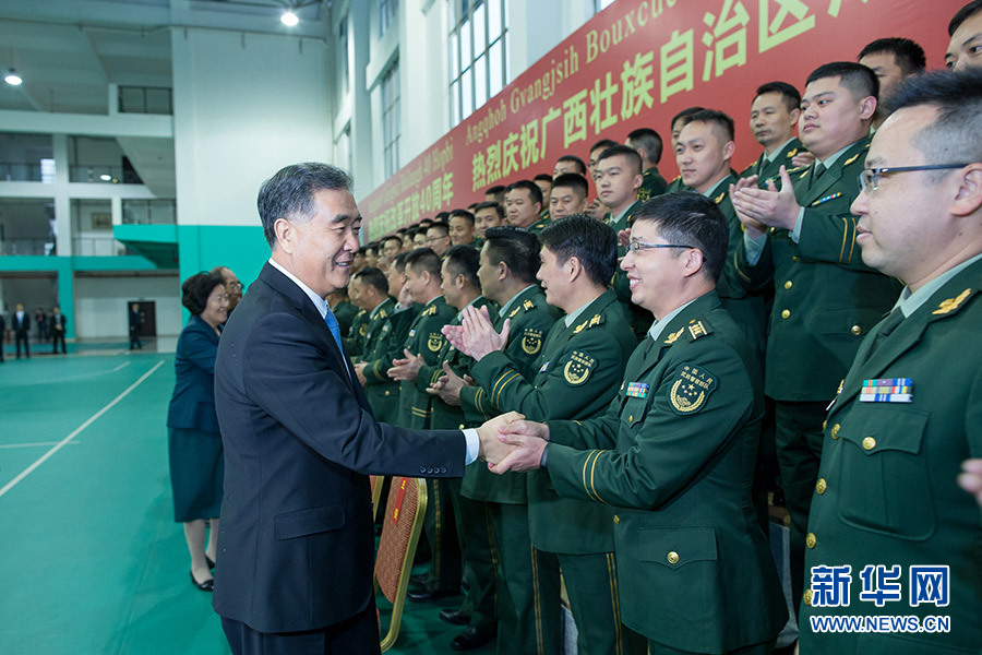 在慰問廣西軍區(qū)和駐桂部隊官兵代表時,汪洋指出,廣西是英雄的省份,是紅色的熱土。老一輩革命家在這里書寫了中國革命史上光輝一頁。廣西軍區(qū)建立以來,一茬接一茬官兵在這里保家衛(wèi)國、無私奉獻,為實現(xiàn)祖國邊疆安寧、人民幸福安康作出了重大貢獻。你們付出的艱辛努力,取得的光輝業(yè)績,黨和政府不會忘記,人民不會忘記。