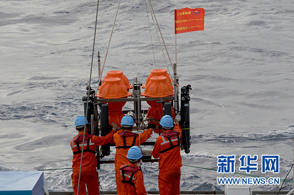 考察隊員將負責采集海水的“彩虹魚”第二代著陸器布放到海里(12月10日攝)。 新華社記者 張建松 攝