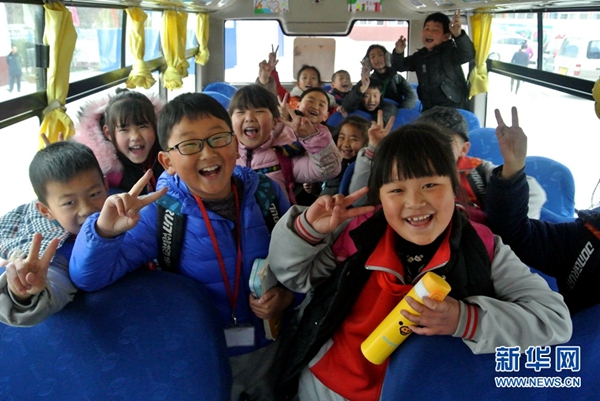 照金北梁紅軍小學(xué)學(xué)生在校車上合影(12月4日攝)。 新華社記者 梁愛平 攝