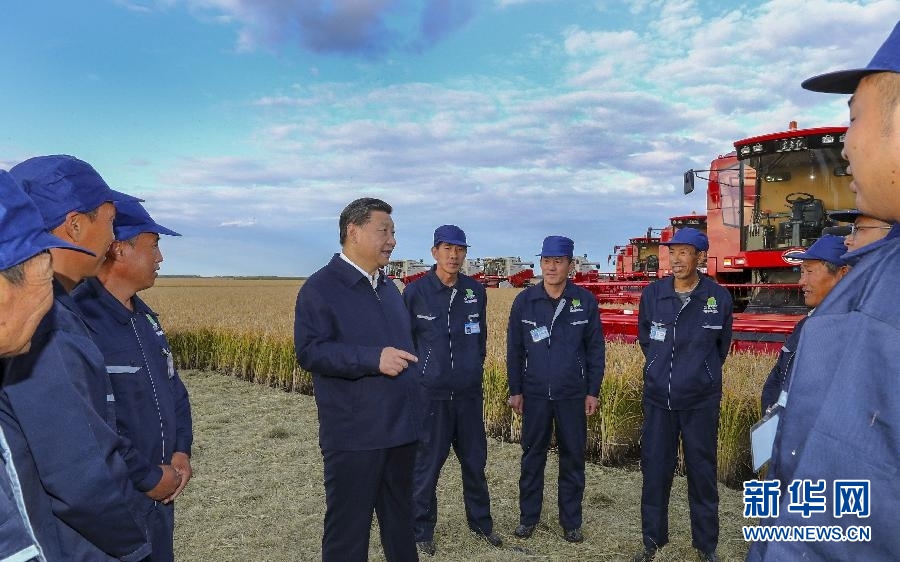 9月25日,習(xí)近平在黑龍江農(nóng)墾建三江管理局七星農(nóng)場(chǎng)萬(wàn)畝大地號(hào)與農(nóng)場(chǎng)工人們親切交談。 新華社記者 謝環(huán)馳 攝