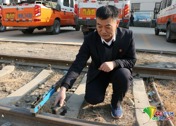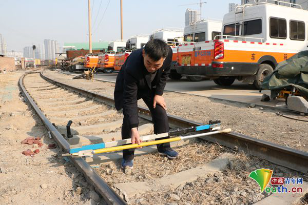 張立昌演示新型軌廓道尺與普通道尺使用區(qū)別。中國青年網(wǎng)記者 李川 攝