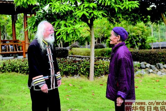 在廣西巴馬瑤族自治縣長壽島,98歲的長壽老人羅耀斌(左)在和一名老人交談(11月8日攝)?!⌒氯A社記者陸波岸攝