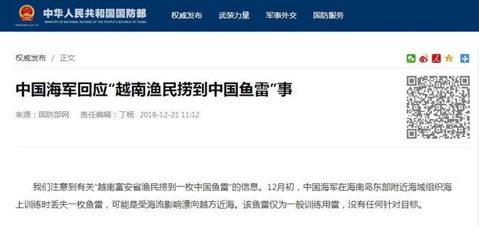 我們注意到有關(guān)“越南富安省漁民撈到一枚中國魚雷”的信息。12月初,中國海軍在海南島東部附近海域組織海上訓練時丟失一枚魚雷,可能是受海流影響漂向越方近海。該魚雷僅為一般訓練用雷,沒有任何針對目標。