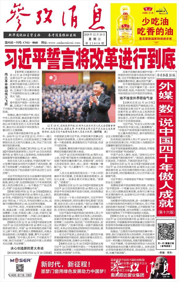 《參考消息》頭版報(bào)道改革開放40周年紀(jì)念大會(huì) 彩版