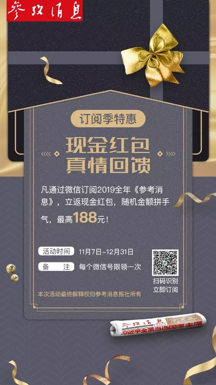 凡通過微信訂閱2019全年《參考消息》,立返現(xiàn)金紅包,隨機(jī)金額拼手氣,最高188元!