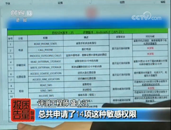 評(píng)測(cè)工程師 盛大江:我們這次測(cè)試權(quán)限的主要方向,涉及了兩個(gè)方面。第一個(gè)是權(quán)限的授權(quán)方式,決定了用戶是否知情并且有選擇權(quán)。第二個(gè)是這些權(quán)限是否有對(duì)應(yīng)的功能。 我們發(fā)現(xiàn)在18款應(yīng)用中,有14款應(yīng)用有25個(gè)敏感權(quán)限,沒(méi)有找到對(duì)應(yīng)的功能。這25個(gè)權(quán)限主要分布在電話權(quán)限、短信權(quán)限、定位權(quán)限,日歷、附件之類的權(quán)限上。