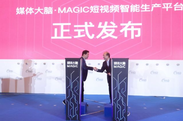 12月27日,在成都世紀(jì)城國(guó)際會(huì)議中心,新華社副社長(zhǎng)、黨組成員劉思揚(yáng)(右)和阿里巴巴集團(tuán)黨委書記、秘書長(zhǎng)邵曉鋒共同出席 “媒體大腦·MAGIC短視頻智能生產(chǎn)平臺(tái)”發(fā)布。