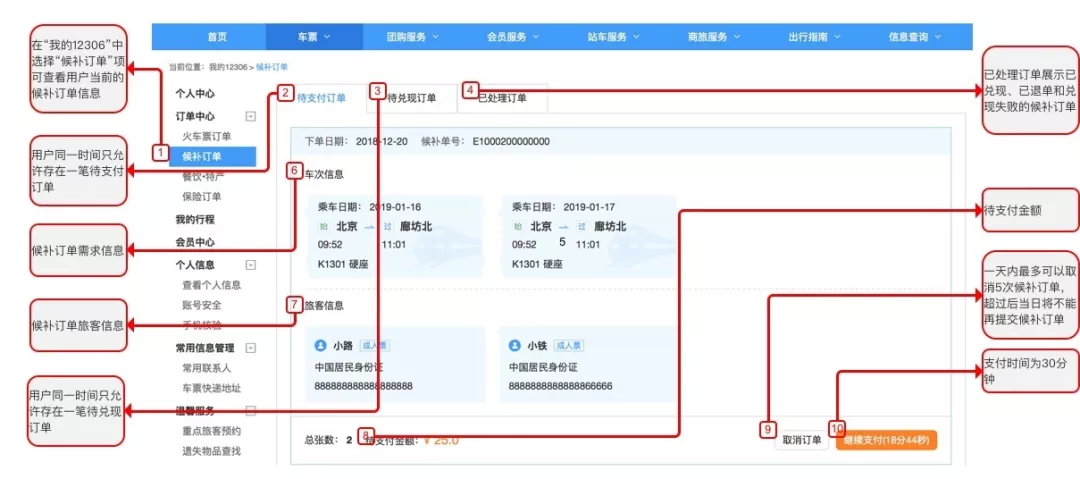 手機APP示意圖 候補訂單提交成功后需在30分鐘內(nèi)完成支付,完成候補預付款支付后,候補購票訂單立即生效。候補購票訂單生效后,相關候補需求不可修改,如需變更,可終止訂單后重新操作。兌現(xiàn)時,按照候補訂單生效的時間順序,兌現(xiàn)符合條件的候補需求。預付款按該單不同組合需求中票款的最高額度計算(臥鋪按下鋪票價計算)。 候補購票預付款支付成功后,系統(tǒng)將持續(xù)嘗試為您兌現(xiàn)候補需求(同一候補需求不進行部分兌現(xiàn)),若有匹配需求的車票,系統(tǒng)將自動為您生成已支付訂單,預付款大于實際票款的,系統(tǒng)將自動退回差額票款;若無匹配需求的車票,系統(tǒng)將在截止兌現(xiàn)時間自動終止兌現(xiàn),用戶主動終止或系統(tǒng)自動終止候補的,系統(tǒng)自動全額退還預付款。 兌現(xiàn)成功或自動終止時,將通過您選擇的通知方式進行告知,請注意查收消息并關注“候補訂單”兌現(xiàn)狀態(tài)。兌現(xiàn)成功車票視為已購車票,退改簽按既有規(guī)則辦理。 劃重點 候補訂單提交成功后 需要在30分鐘內(nèi)完成支付 預付款按組合需求中票款最高額度計算 系統(tǒng)自動退回差額票款 登錄12306.cn網(wǎng)站,在個人中心導航欄上點擊“候補訂單”可進入訂單查看頁,候補訂單分為“待支付訂單”、“待兌現(xiàn)訂單”和“已處理訂單”三個選項,其中“已處理訂單”包含已兌現(xiàn)、已退單和兌現(xiàn)失敗三種狀態(tài)訂單,已兌現(xiàn)表示候補需求兌現(xiàn)成功;已退單表示用戶主動退單;兌現(xiàn)失敗表示候補需求兌現(xiàn)失敗,可能為車票數(shù)量不足、與實名制規(guī)定沖突等原因。
