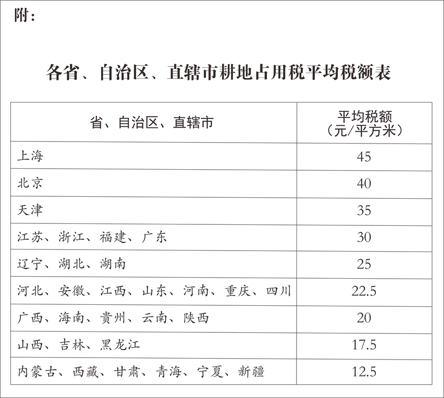 各地區(qū)耕地占用稅的適用稅額,由省、自治區(qū)、直轄市人民政府根據(jù)人均耕地面積和經(jīng)濟(jì)發(fā)展等情況,在前款規(guī)定的稅額幅度內(nèi)提出,報(bào)同級人民代表大會常務(wù)委員會決定,并報(bào)全國人民代表大會常務(wù)委員會和國務(wù)院備案。各省、自治區(qū)、直轄市耕地占用稅適用稅額的平均水平,不得低于本法所附《各省、自治區(qū)、直轄市耕地占用稅平均稅額表》規(guī)定的平均稅額。