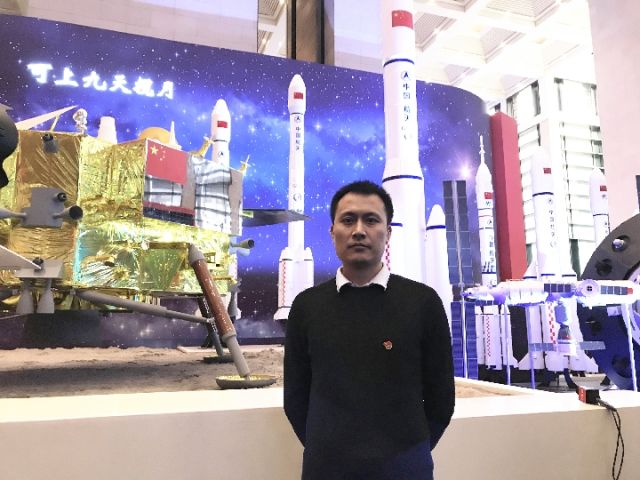 何巍在“偉大的變革——慶祝改革開(kāi)放40周年”大型展覽的長(zhǎng)征系列火箭展區(qū),接受媒體采訪。新華社記者屈婷攝