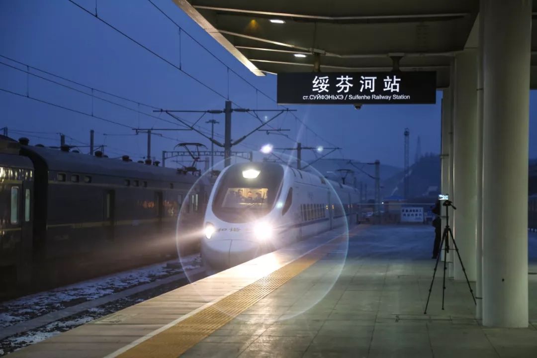 2018-12-25,黑龍江省綏芬河市。12月25日6時31分,隨著D7961次列車駛進(jìn)黑龍江省最大的對俄口岸綏芬河站,綏芬河口岸迎來了期盼已久的動車時代。作者:石頭