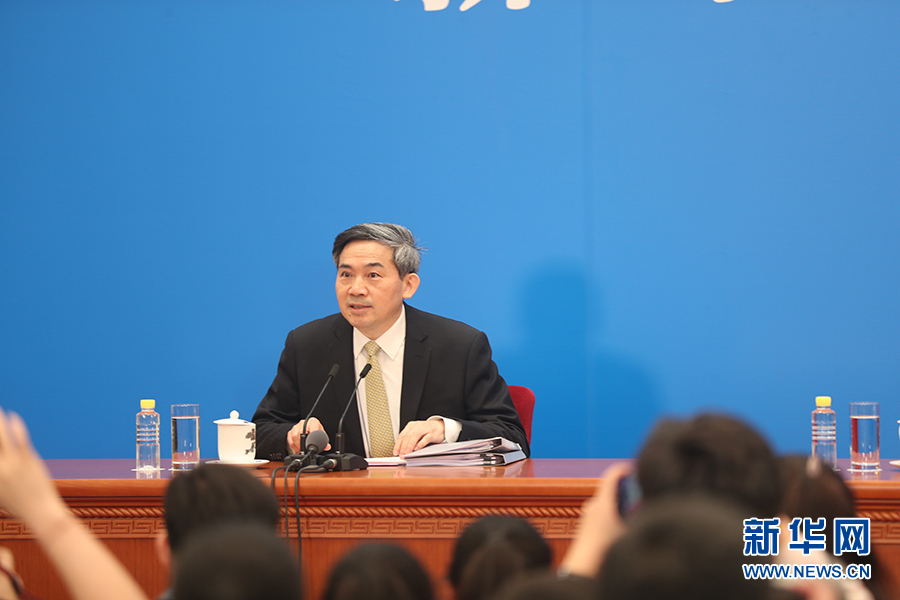 3月4日,十三屆全國人大一次會議在人民大會堂新聞發(fā)布廳舉行新聞發(fā)布會,由大會發(fā)言人張業(yè)遂就大會議程和人大工作相關的問題回答中外記者的提問。圖為新聞發(fā)布會主持人何紹仁。新華網(wǎng)/中國政府網(wǎng) 陳杰 攝