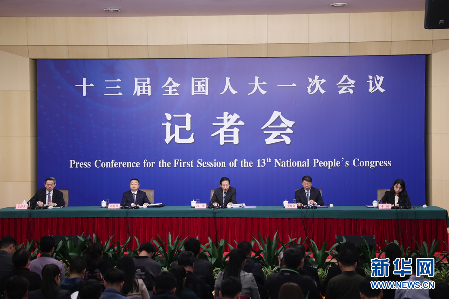 十三屆全國人大一次會議新聞中心于3月7日上午在梅地亞中心多功能廳舉行記者會,邀請財政部部長肖捷,副部長史耀斌、胡靜林就“財稅改革和財政工作”相關問題回答中外記者提問。圖為肖捷(中)回答記者提問。新華網(wǎng)/中國政府網(wǎng) 翟子赫 攝
