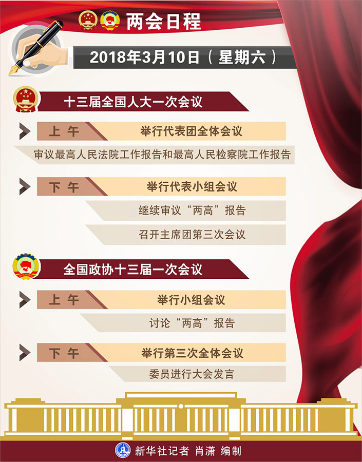 新華社北京3月9日電 十三屆全國(guó)人大一次會(huì)議10日上午舉行代表團(tuán)全體會(huì)議,審議最高人民法院工作報(bào)告和最高人民檢察院工作報(bào)告。下午舉行代表小組會(huì)議,繼續(xù)審議“兩高”報(bào)告,召開(kāi)主席團(tuán)第三次會(huì)議。