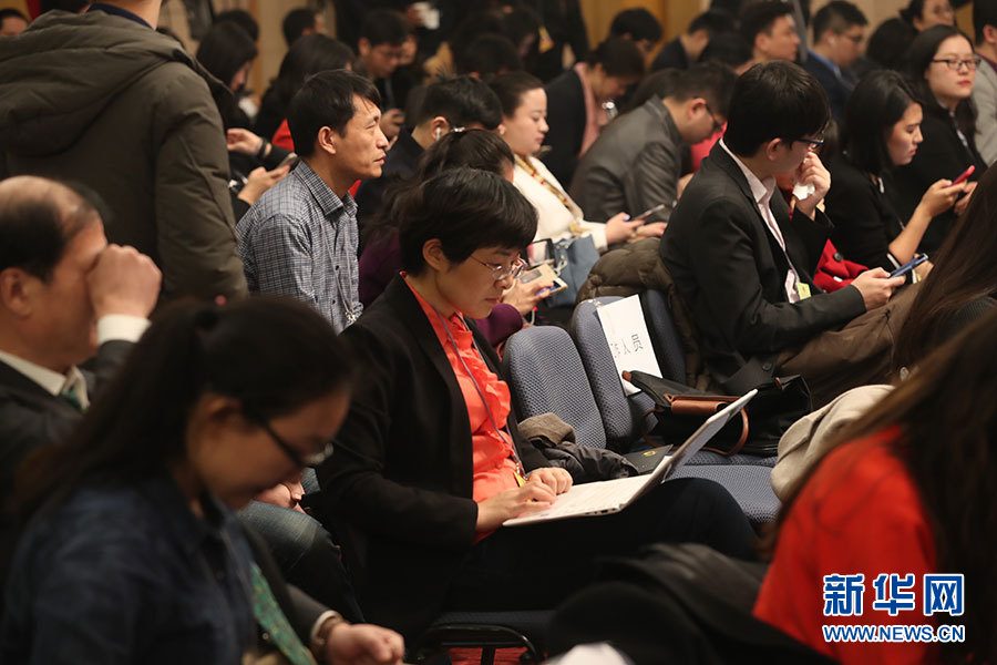 3月10日8時(shí)45分,全國政協(xié)十三屆一次會(huì)議將在梅地亞中心多功能廳舉行記者會(huì),邀請(qǐng)5位全國政協(xié)委員就“提高保障和改善民生水平”回答記者提問。圖為記者在現(xiàn)場(chǎng)采訪。新華網(wǎng)/中國政府網(wǎng) 陳杰 攝