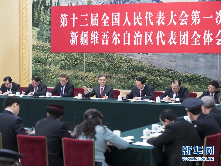 3月12日,中共中央政治局常委、國(guó)務(wù)院副總理汪洋參加十三屆全國(guó)人大一次會(huì)議新疆代表團(tuán)的審議。 新華社記者 王曄 攝