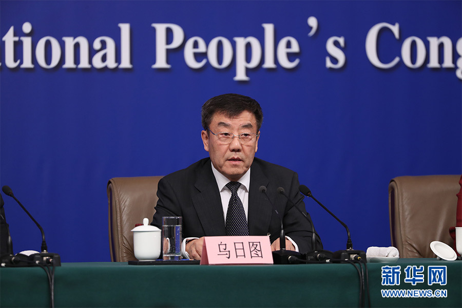 3月12日,十三屆全國人大一次會(huì)議新聞中心在梅地亞中心多功能廳舉行記者會(huì),邀請(qǐng)十二屆全國人大內(nèi)司委副主任委員王勝明、財(cái)經(jīng)委副主任委員烏日?qǐng)D、教科文衛(wèi)委副主任委員吳恒、環(huán)資委委員呂彩霞,全國人大常委會(huì)法工委副主任王超英、副主任許安標(biāo)就“人大立法工作”相關(guān)問題回答中外記者提問。圖為財(cái)經(jīng)委副主任委員烏日?qǐng)D回答記者提問。新華網(wǎng)/中國政府網(wǎng) 翟子赫 攝