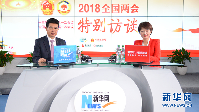 3月14日,全國政協(xié)委員、蘇寧環(huán)球董事長張桂平(左)做客新華網(wǎng)2018全國兩會特別訪談。新華網(wǎng) 楊濛攝