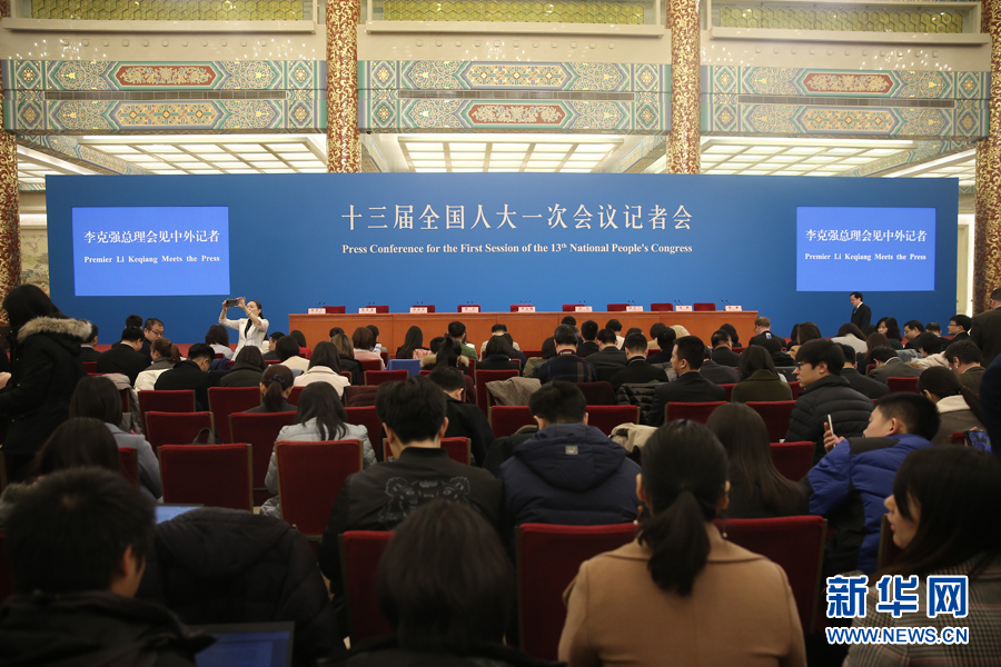 3月20日上午,十三屆全國(guó)人大一次會(huì)議閉幕后,國(guó)務(wù)院總理李克強(qiáng)將在人民大會(huì)堂三樓金色大廳會(huì)見采訪十三屆全國(guó)人大一次會(huì)議的中外記者并回答記者提出的問(wèn)題。圖為記者會(huì)現(xiàn)場(chǎng)。 新華網(wǎng)/中國(guó)政府網(wǎng) 翟子赫 攝