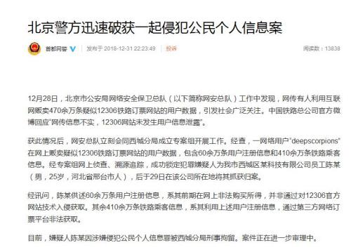 據(jù)北京市公安局網(wǎng)絡安全保衛(wèi)總隊微博消息,北京警方破獲一起侵犯公民個人信息案,網(wǎng)上販賣470余萬條疑似12306鐵路訂票網(wǎng)站用戶數(shù)據(jù)的犯罪嫌疑人陳某,已被刑拘。