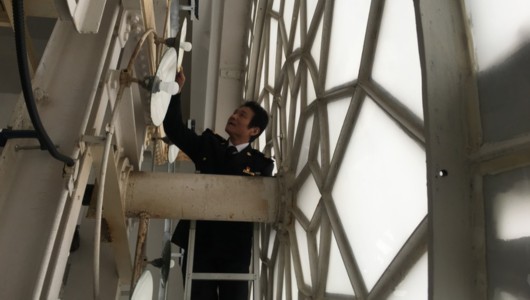 2018年最后一天,上海海關(guān)不上班,但魏云寺依然保持他3天一個(gè)輪回的節(jié)奏——坐電梯到海關(guān)大樓頂樓,打開一扇門,沿著僅容一人通行的鋼制螺旋扶梯,踩69級(jí)臺(tái)階,登上鐘樓機(jī)芯房,給大鐘上發(fā)條并校正時(shí)間,全程15分鐘。如此重復(fù)性工作,看上去并無太多技術(shù)含量,要說他最大的付出,就是已被“套牢”的28年。