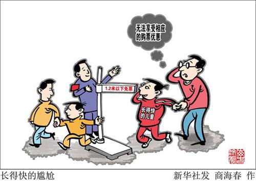 為人父母者,都希望自己的孩子長成“大高個兒”,但“大高個兒”也常常遇到煩惱,比如因為個子超過“限高”,很多兒童無法享受相應(yīng)的購票優(yōu)惠。長得快的兒童也是兒童,基于身高制定的兒童優(yōu)惠標(biāo)準(zhǔn)能不能與時俱進,讓“個兒大”的孩子也能享受針對兒童的優(yōu)惠政策?