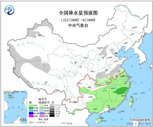 1月5日08時(shí)至6日08時(shí),新疆北部和南疆盆地、西藏西部和北部、青海西部、山西北部、黃淮中南部、江淮北部、江漢中北部等地的部分地區(qū)有小雪或雨夾雪,局地中雪;四川盆地南部、江漢南部、江淮南部、江南、華南大部和臺(tái)灣島等地的部分地區(qū)有小到中雨。新疆東部和山東半島等地的部分地區(qū)有4~6級(jí)及以上風(fēng)(見(jiàn)圖2)。