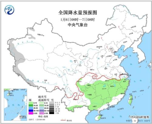 1月4日08時(shí)至5日08時(shí),黑龍江中東部、北疆北部和南疆西部山區(qū)、青海中東部、西藏東部和西部、川西高原、陜西中南部、湖北西部、黃淮西部和東南部等地的部分地區(qū)有小雪或雨夾雪;江漢、江淮及其以南大部地區(qū)、西南地區(qū)東部和南部等地的部分地區(qū)有小到中雨,江西中北部、浙江中部和廣西東北部等地的部分地區(qū)有大雨(25~35毫米)。內(nèi)蒙古中北部、黑龍江東北部、遼東半島和山東半島等地的部分地區(qū)有4~6級(jí)及以上風(fēng)(見(jiàn)圖1)。北部灣、瓊州海峽、廣東西部沿岸部分海域?qū)⒂写箪F天氣。