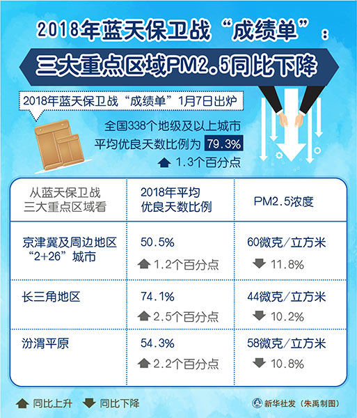圖表:2018年藍(lán)天保衛(wèi)戰(zhàn)“成績(jī)單”:三大重點(diǎn)區(qū)域PM2.5同比下降 新華社發(fā) 朱禹 制圖