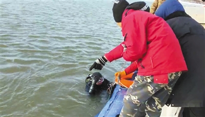 1月2日,哈爾濱兩男子駕車橫跨冰面后墜入江中,圖為救援人員潛水搜尋。受訪者供圖