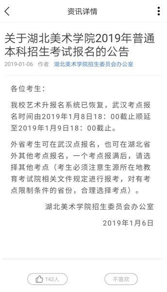 1月6日,湖北美術學院發(fā)布的報名時間順延通告。