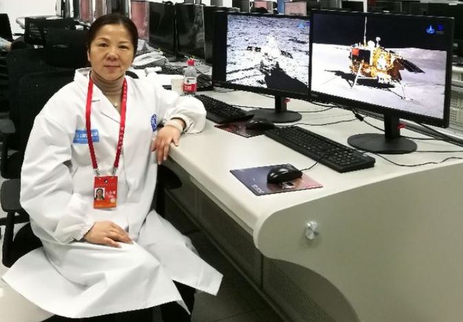 張玉花在嫦娥四號著陸器與月球車玉兔二號互拍后留影。航天科技集團(tuán)八院供圖