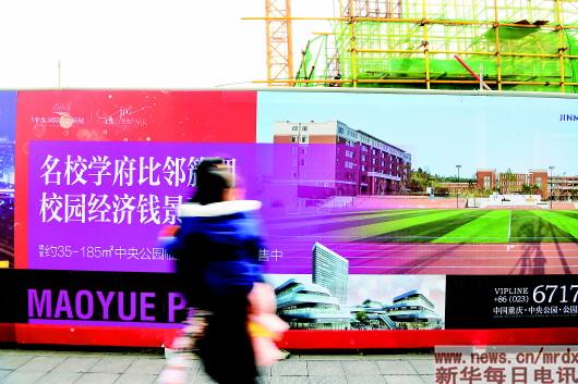 ▲1月16日,重慶渝北中央公園,一位市民抱著孩子從寫有“名校學(xué)府”字樣的房地產(chǎn)廣告前走過。在重慶,許多樓盤將中小學(xué)名校作為賣點進行宣傳營銷。記者王全超攝