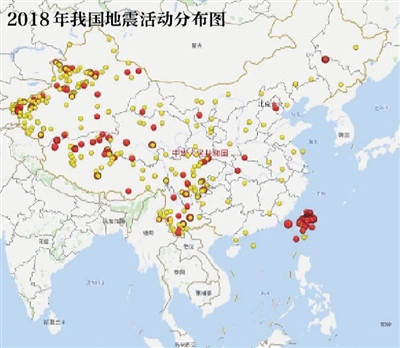 圖中黃色圓點表示3.0級以上地震,紅色圓點表示4.0級以上地震。圓點越大,震級越強(qiáng)。 中國地震局 供圖