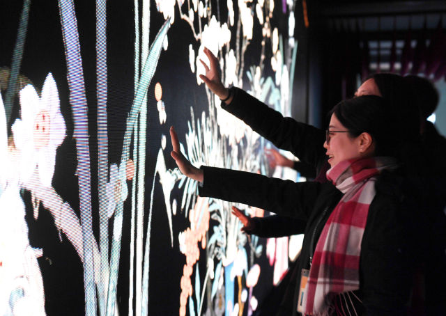 1月21日,人們體驗數(shù)字沉浸體驗展“花開歲朝”部分,揮動手臂,蝴蝶飛舞,花枝搖曳。