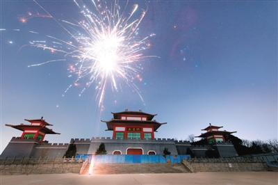 在山東省濟南市武圣門,新年的煙花和“福祿壽”三星共同綻放在夜空。襲清攝