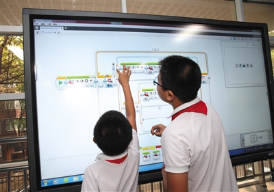 北京十八中學(xué)教育集團(tuán)課程展示活動(dòng)中的樂(lè)高機(jī)器人課上,學(xué)生正在為機(jī)器人編程。資料圖片/記者 王遠(yuǎn)征 攝