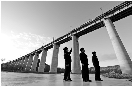 圖① 冬季瑟爾基河冰封,橋下經(jīng)常有人穿行。為防止橋上石砟因火車經(jīng)過震動(dòng)落下砸到人,民警經(jīng)常踏冰巡視。