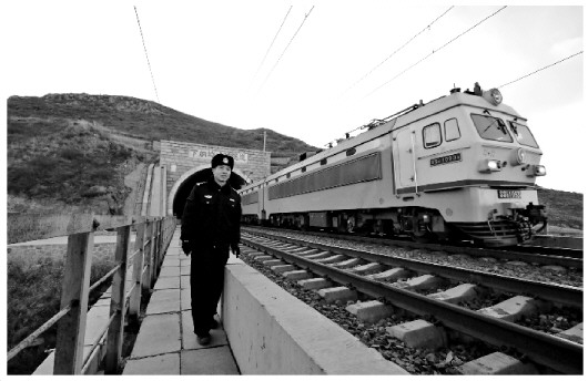 56歲的老民警朱效國(guó)已經(jīng)有些駝背了,但精神狀態(tài)很好。他介紹,下納嶺特大橋全長(zhǎng)3.8公里,橋離地面高度約50米,恐高的人可巡不完線路。冬季天冷倒不怕,就怕刮風(fēng),橋太高了,很危險(xiǎn)。只要不刮風(fēng)就是好天氣。我們巡線的目的就是,一是看線路上的設(shè)備有沒有損壞的,另一個(gè)就是看看有沒有危害火車安全的,有沒有山上滾下的落石和其他雜物,以保障列車通行安全。