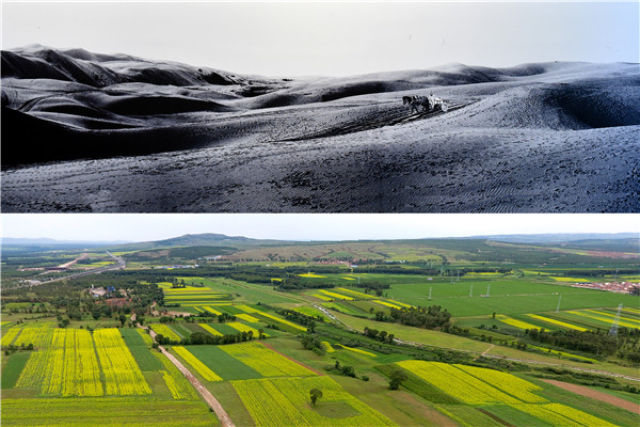 上圖為治理前,山西省右玉縣隨處可見半流動(dòng)沙丘(資料照片);下圖為山西省右玉縣威遠(yuǎn)鎮(zhèn)治理后的荒沙地,如今已郁郁蔥蔥。(新華社記者詹彥攝·2017年)