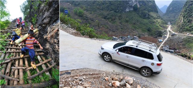 右圖:修通水泥路之后,弄頂屯的家長(zhǎng)開著汽車去學(xué)校接孩子回家。(新華社記者黃孝邦攝·2017年)。
