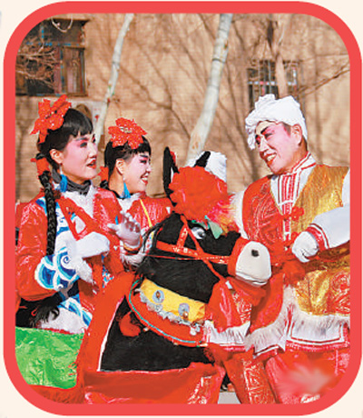 甘肅敦煌市2019迎新春社火大賽活動(dòng)現(xiàn)場(chǎng),參賽隊(duì)員表演社火跑驢。張曉亮攝(人民視覺)