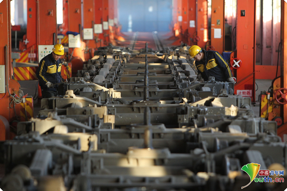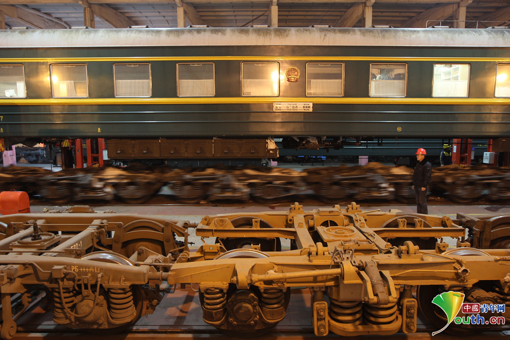 康亞斌和同事們所在的聯(lián)運檢修車間擔負著北京至烏蘭巴托、北京至莫斯科以及呼和浩特至烏蘭巴托等6趟國際旅客列車換輪任務,還要對這些車輛重要部件進行定期檢修。