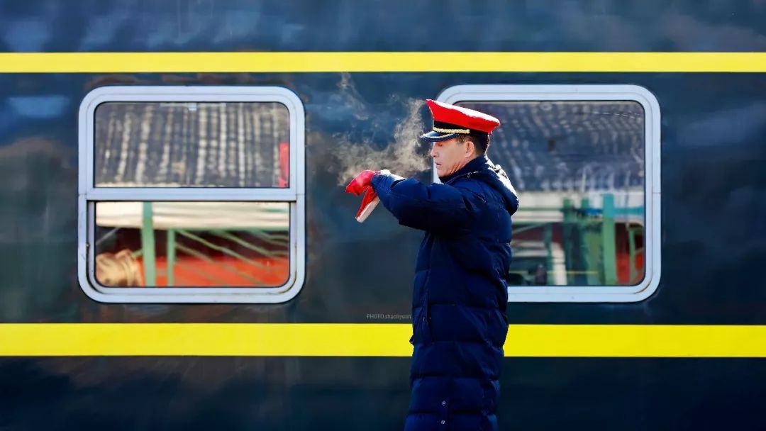 2019-01-31,吉林省白山市江源站。鐵路工作人員在發(fā)車前核對時間的瞬間。作者:了凡大叔