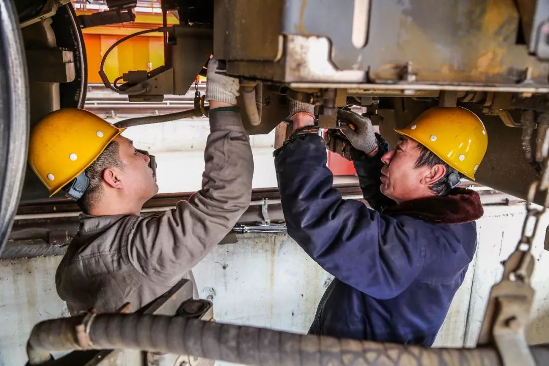 2019-02-08,唐山機務(wù)段。大年初四,唐山機務(wù)段的整備人員正在檢修機車走行部,確保出庫機車質(zhì)量良好。作者:樂亭閑人