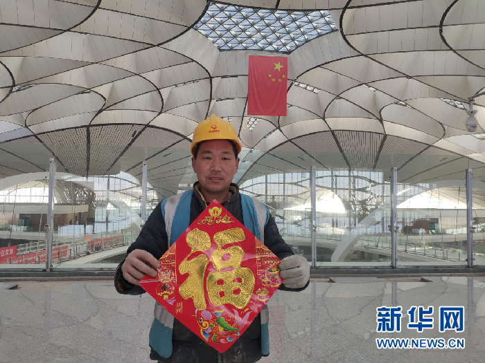 圖片說明:大興機(jī)場(chǎng)航站樓春節(jié)期間值守的工人舉起了“?!弊帧?攝影:新華網(wǎng)錢春弦