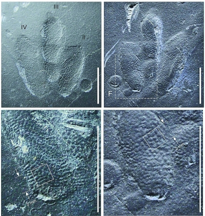 古生物學家還發(fā)現(xiàn),小龍足跡的鱗片模式與其他肉食性獸腳類恐龍的足跡相似,而明顯區(qū)別于古鳥類的腳底鱗片模式。此前發(fā)現(xiàn)的肉食性獸腳類恐龍足跡的鱗片要大得多,直徑可達2厘米左右,大約一個硬幣那么大?!斑@表明所有的獸腳類恐龍都有類似的鱗片模式,小龍足跡上精致的保存完好的鱗片模式,就像比它大得多的近親鱗片的縮小版?!毙狭⑦_說。(記者張蕾)
