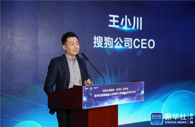 2月19日,新華社聯(lián)合搜狗公司在京發(fā)布全新升級(jí)的站立式AI合成主播并推出全球首個(gè)AI合成女主播。圖為搜狗公司CEO王小川致辭。新華社記者 肖磊濤 攝
