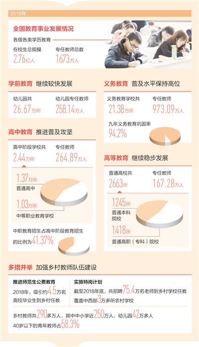 2018年,我國各級各類教育均取得較大成就。學前教育快速發(fā)展,九年義務教育繼續(xù)鞏固,大班額、超大班額大幅下降,絕大多數(shù)義務教育學校達到辦學底線要求,偏遠山區(qū)教學點變得小而美、小而全,貧困地區(qū)教師隊伍煥發(fā)新活力,高考綜合改革試點各地因地制宜制定方案……教育改革發(fā)展的各項工作正蹄疾步穩(wěn)、有序推進。