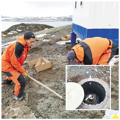 科考隊(duì)員挖掘觀測儀器安放坑。小圖為南極地震臺站觀測儀器安放坑。